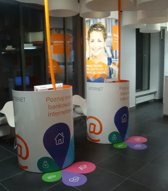 Branding urządzeń czyli oznakowanie urządzeń, które ułatwia klientom ich obsługę – nawiguje klientów obsługujących urządzenia. Górne panele są podświetlane. Naklejki, które tworzymy są trudne do demontażu oraz nie zmieniają wymiarów ani koloru pod wpływem warunków atmosferycznych. Dodatkową opcją jest wykonanie zapisu alfabetem Braille’a.